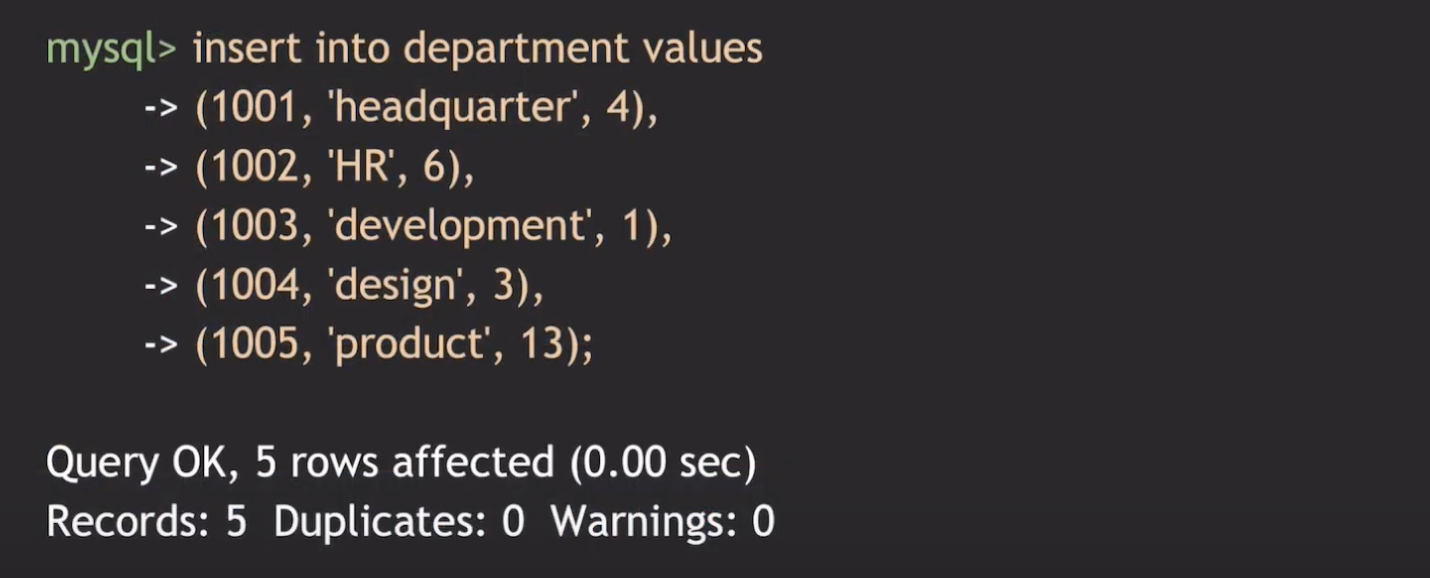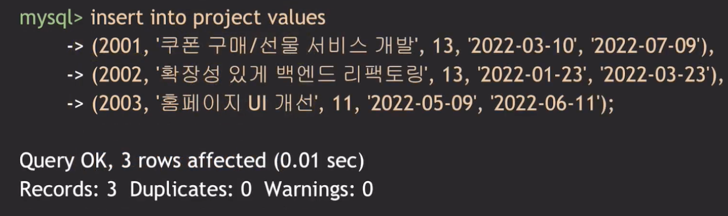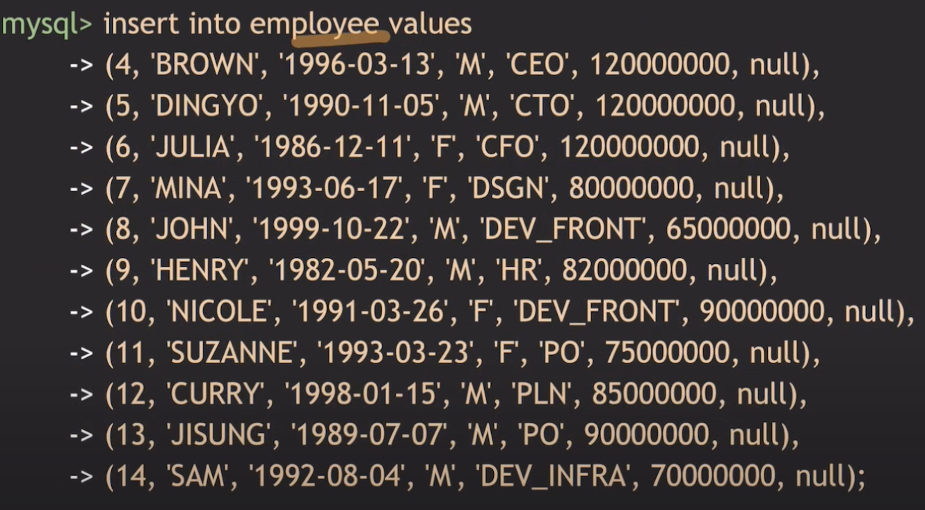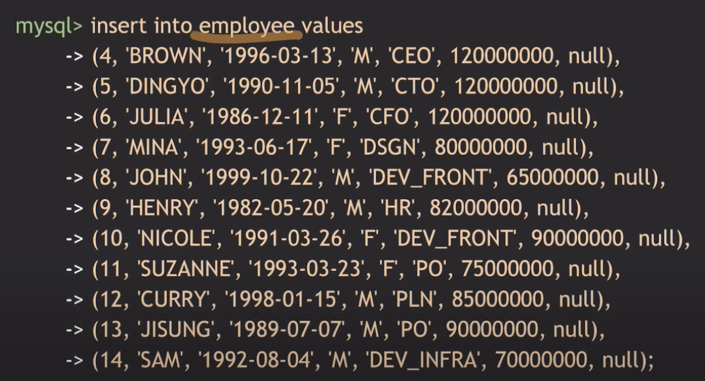 하나 또는 두 개 이상의 데이터를 넣기 위해서는 위와 같은 명령어 문법을 따르면 됩니다. 다음과 같이 INSERT INTO table_name VALUES (), (), (), ...(); 을 활용해서 데이터를 삽입한 것을 확인할 수 있다.
