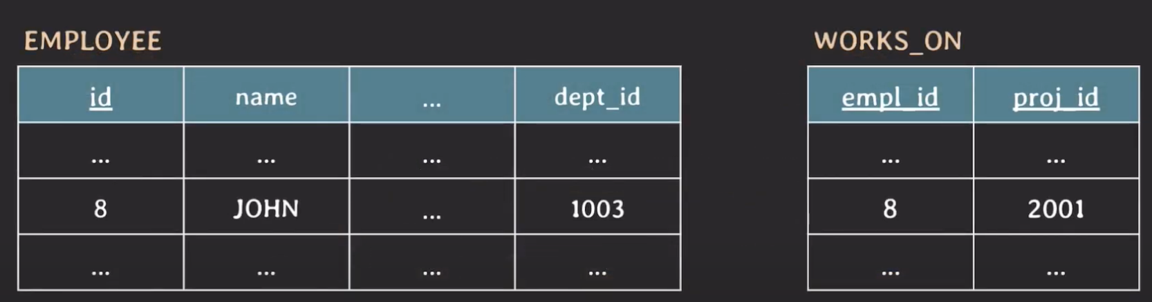 예를들어, John이 퇴사를 하게 되면서 employee 테이블에서 john 정보를 삭제해야한다. john의 employee id는 8이다. 현재 john은 project 2001에 참여하고 있었다. 이때, 존과 관련된 테이블은 두 개에 테이블에 나누어서 저장되어있다.