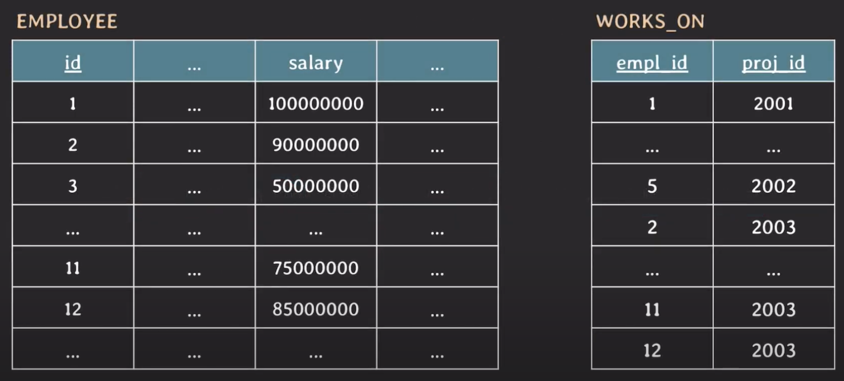 다른 예시로, 프로젝트 ID 2003에 참여한 임직원의 연봉을 두 배로 인상하고 싶다. 이 때는 두 개의 테이블을 참조해야한다. 즉 두개의 테이블을 연결 시켜줘야한다.