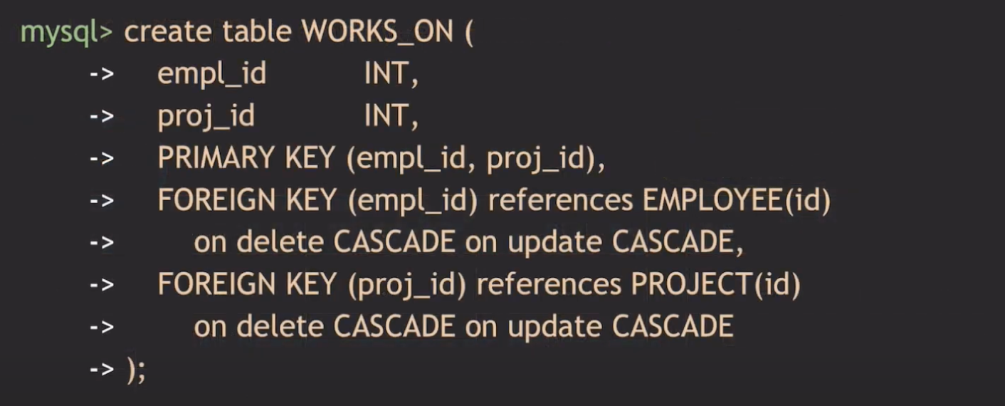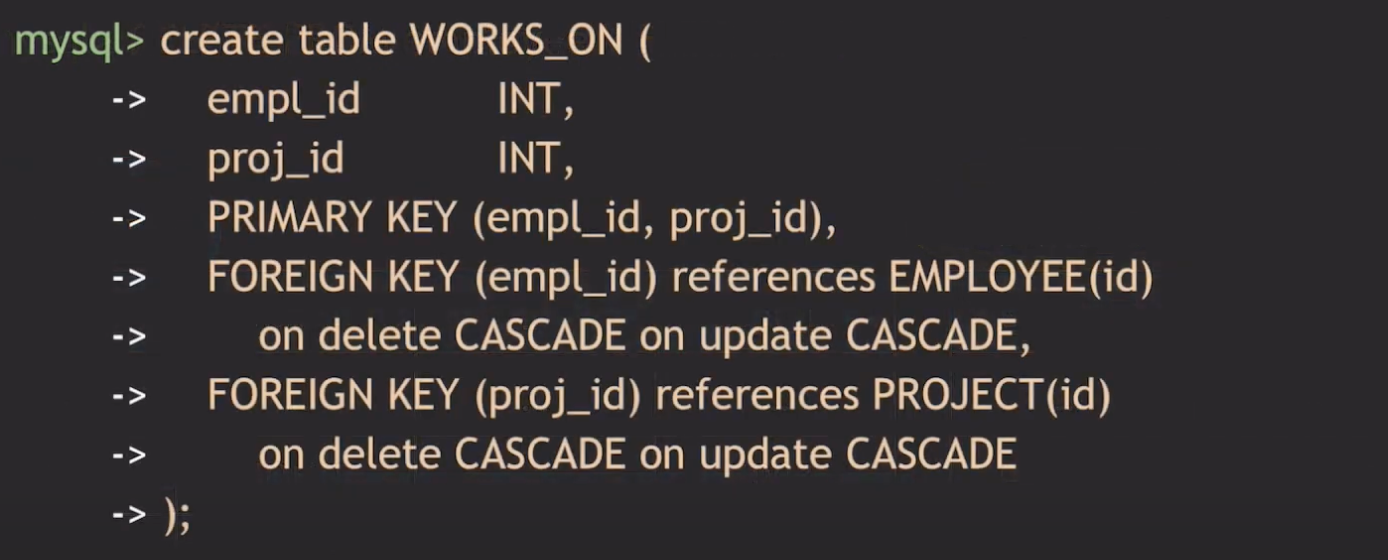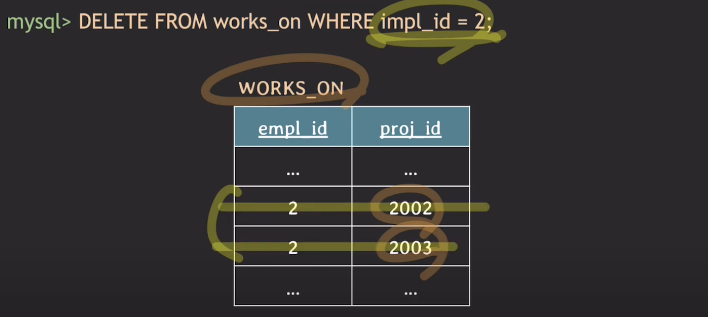 ❗️이렇게 작성하면 employee에서 존의 정보를 삭제가 된다. 이때 works_on에 대한 정보도 함께 지워줘야할까?! 정답은 NO, 왜냐하면 WORKS_ON의 테이블을 작성할 때 foreign 키를 작성해뒀기 때문이다. 즉, 참조값이 변경/삭제 되면 그대로 반영되도록 설정해 뒀다.