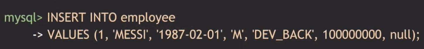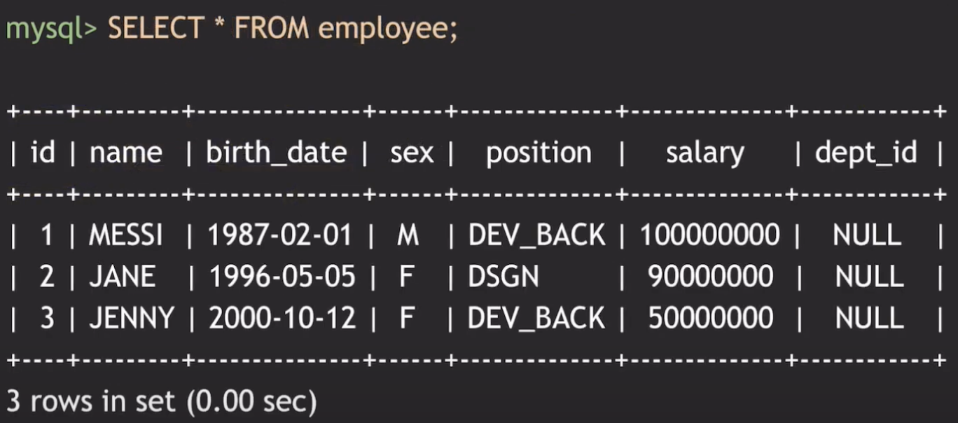 *이처럼 JENNY의 셀러리는 기본값이(JENNY는 id, name, birth_data, sex, position에 대해서만 데이터를 추가했기 때문) 그리고 dept_id는 아직 데이터가 없기 때문에 NULL값이 들어갔음을 확인할 수 있다.