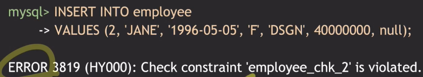 위 사진은 default 값을 위반했기 때문에 발생하는 에러이다. 하지만 employee_chk_2 라는 메시지만 보고서는 정확인 어떤 부분에서 에러가 발생했는지 파악할 수 없기 때문에 다음과 같은 명령어를 통해 좀 더 구체적으로 에러를 확인할 수 있다.