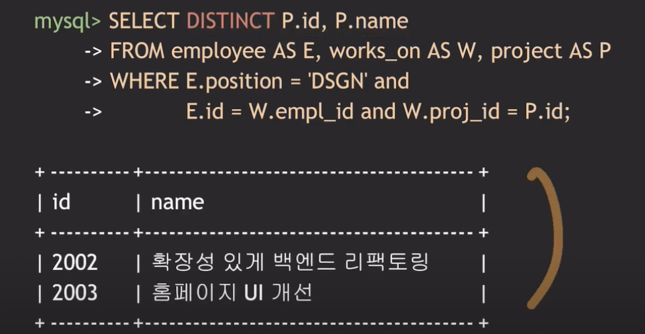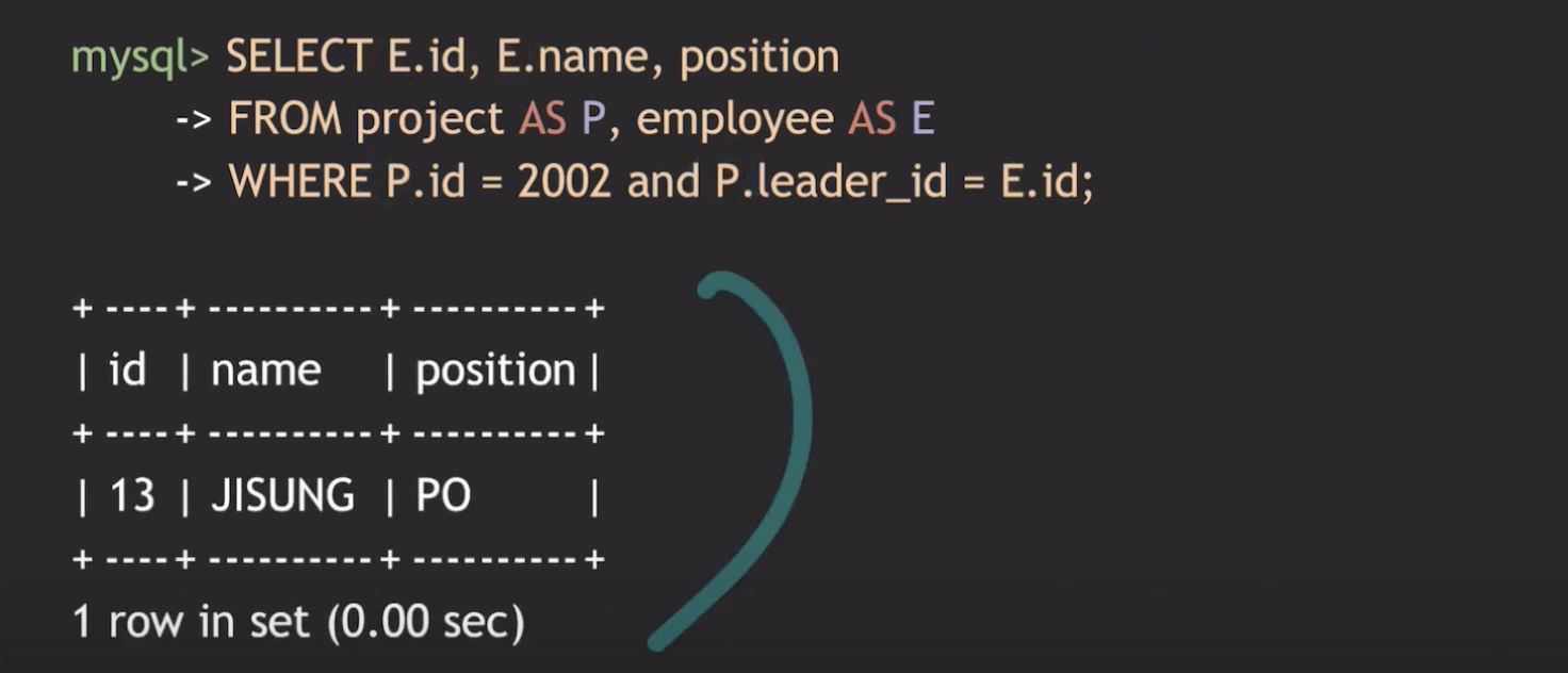 AS는 테이블이나 attribute에 별칭을 붙일 때 사용한다. 그리고 생략이 가능하다. AS를 사용하는 이유는 좀 더 효율적으로 쿼리문을 작성하기 위함입니다. 좀 전에 더 명시적으로 데이터를 표현하기 위해서 project.id or employee.id 이런식으로 작성한다고 했는데, 만약 데이블 이름이 길면 일일이 타이핑하는 것이 번거로운 일이될 수 있습니다.