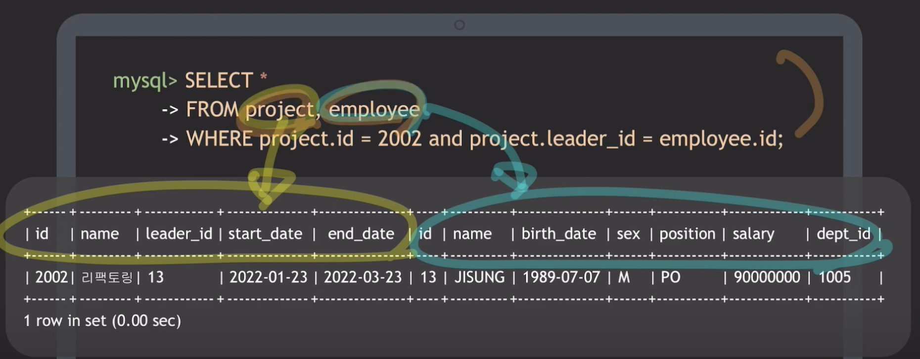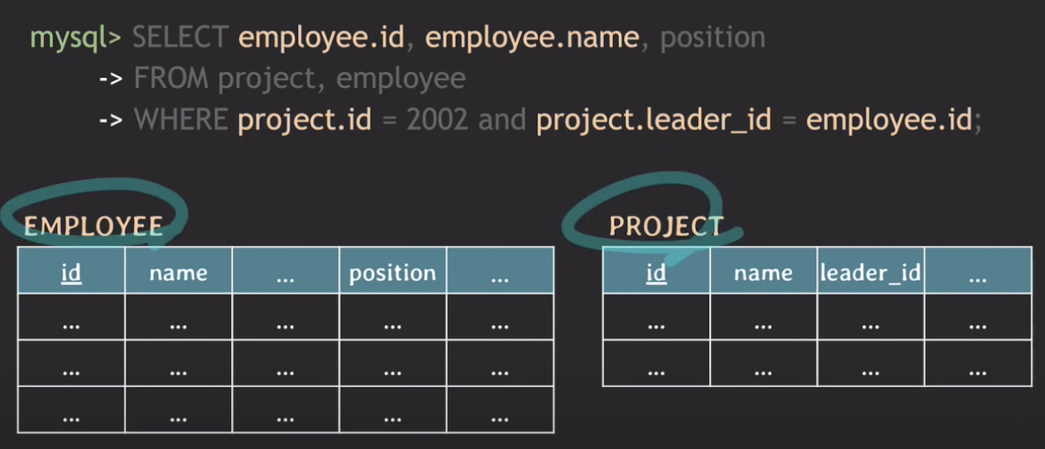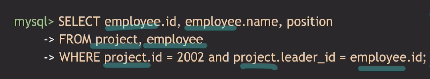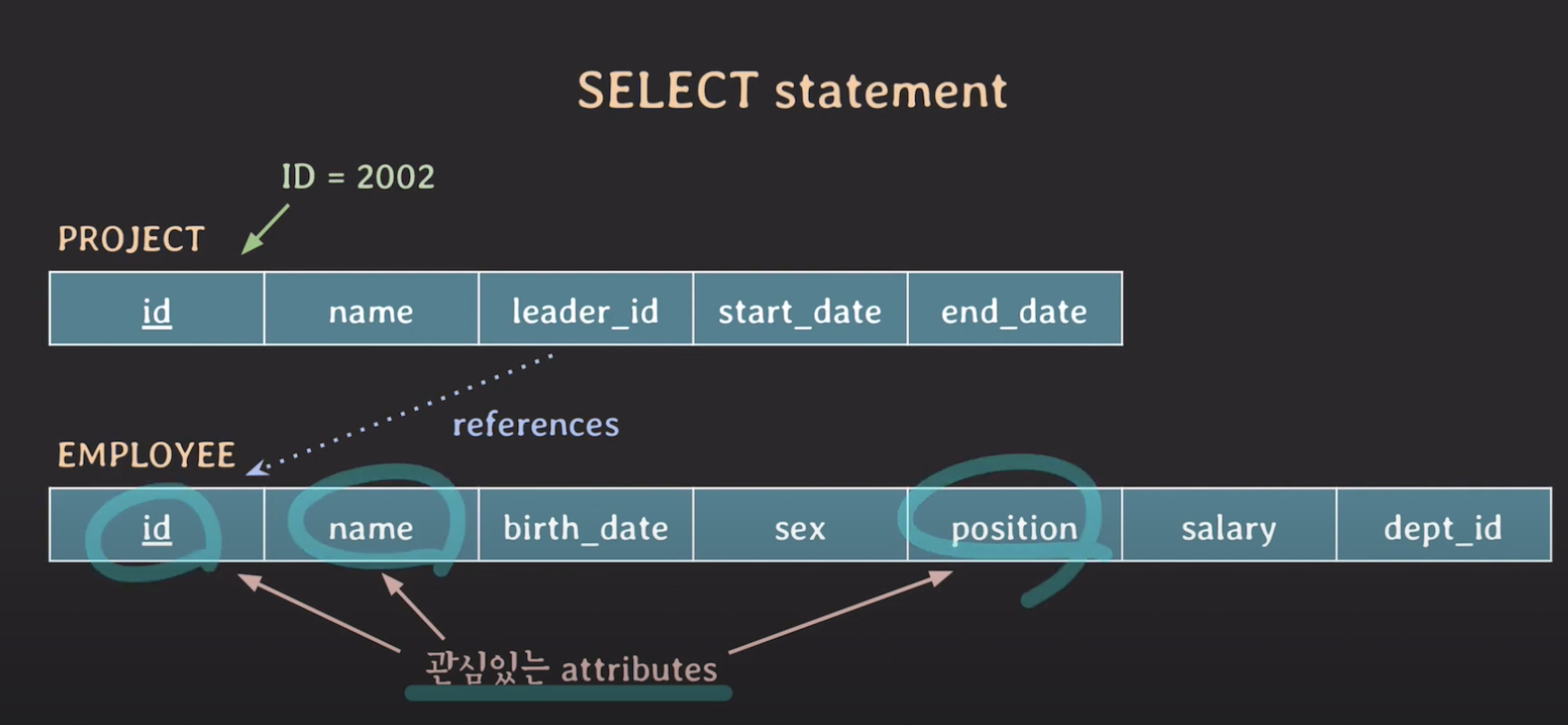 그리고 SELECT 문을 작성할 때, 테이블 이름과 속성을 함께 작성하는 이유는 테이블 마다 속성 이름이 똑같은 경우가 있기 때문에 혼동을 막기 위해서 작성합니다. 아래 사진에서 PROJECT 테이블에서 leader_id 는 고유하기 때문에 테이블 이름과 함께 안써줘도 되지만 좀 더 명시적으로 해주기 위해서 아래와 같이 작성하는 것을 추천합니다.