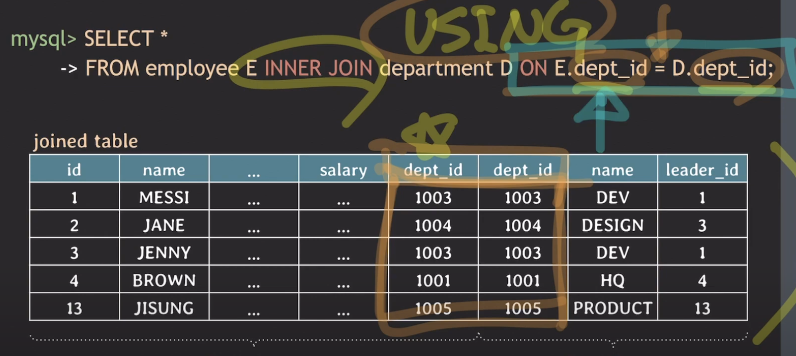 USING을 사용하면 결과 테이블에 dept_id 속성이 한번만 표시가 됩니다.