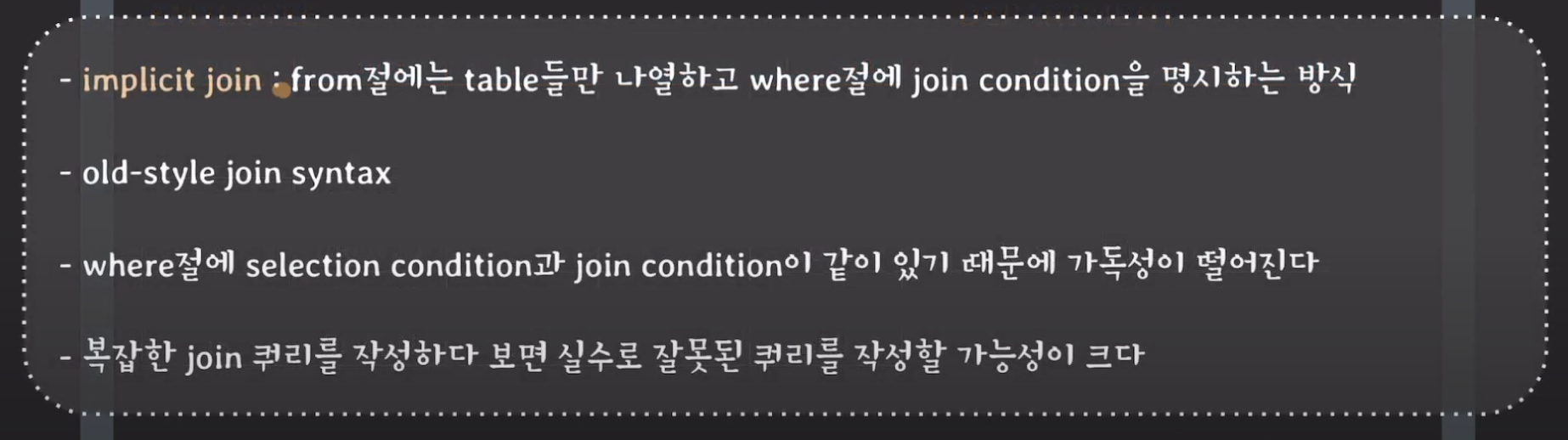 이렇게 FROM절에는 테이블만 나열하고 WHERE절에 join condition을 명시하는 방식을 implicit 방식이라 합니다.