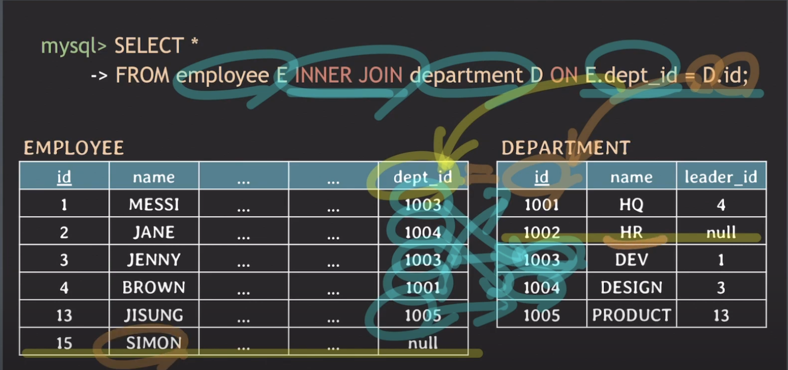 SELECT * FROM employee E INNER JOIN department D ON E.dept_id = D.id;