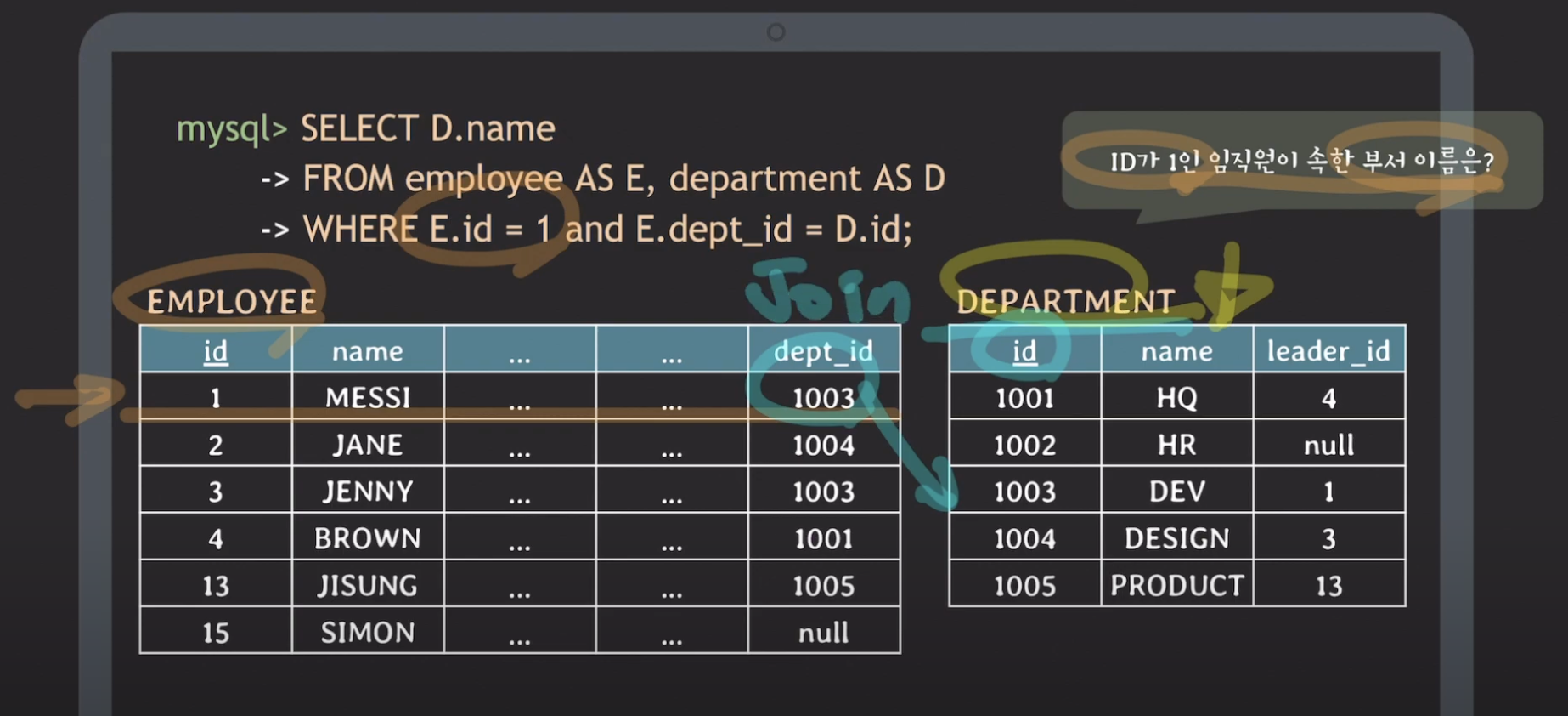 WHERE E.id = 1 AND E.dept_id = D.id;