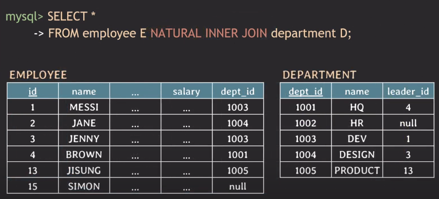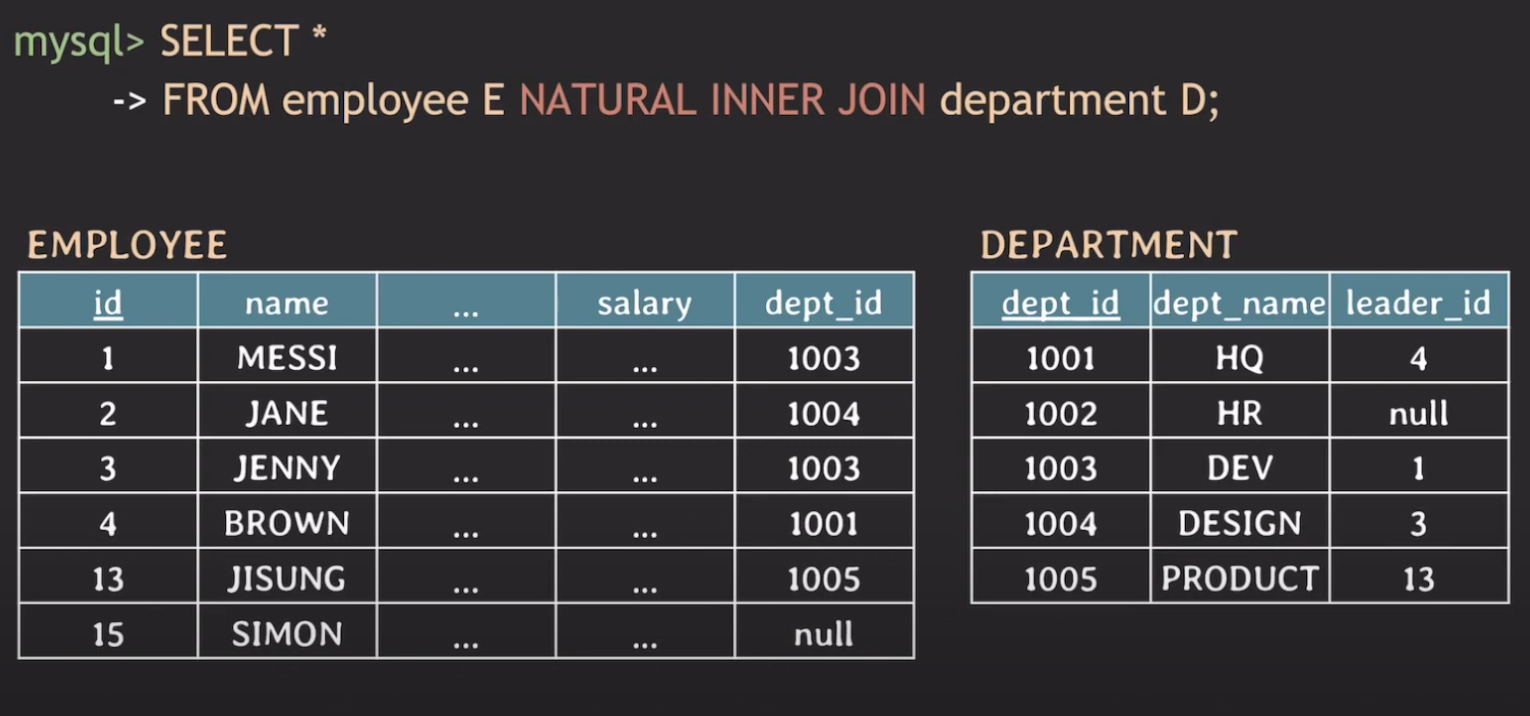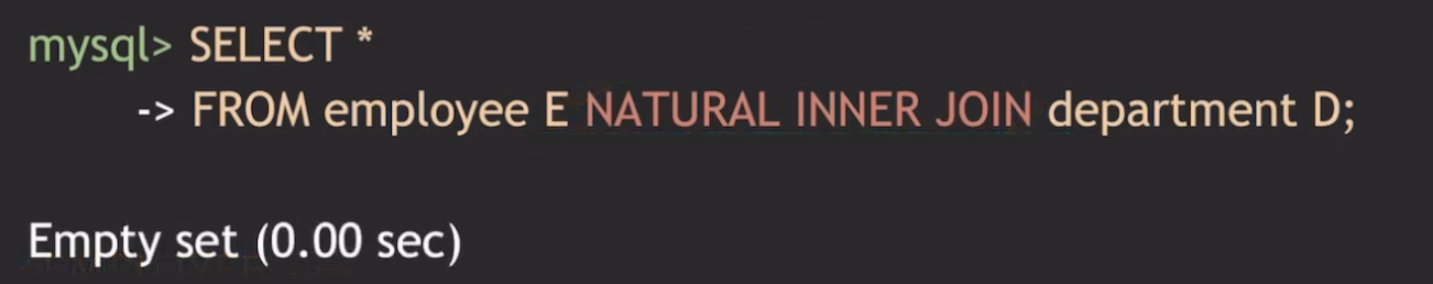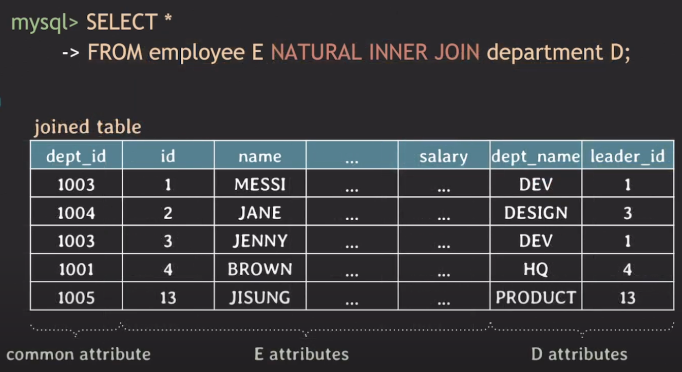 SELECT FROM employee E NATURAL INNER JOIN department D;