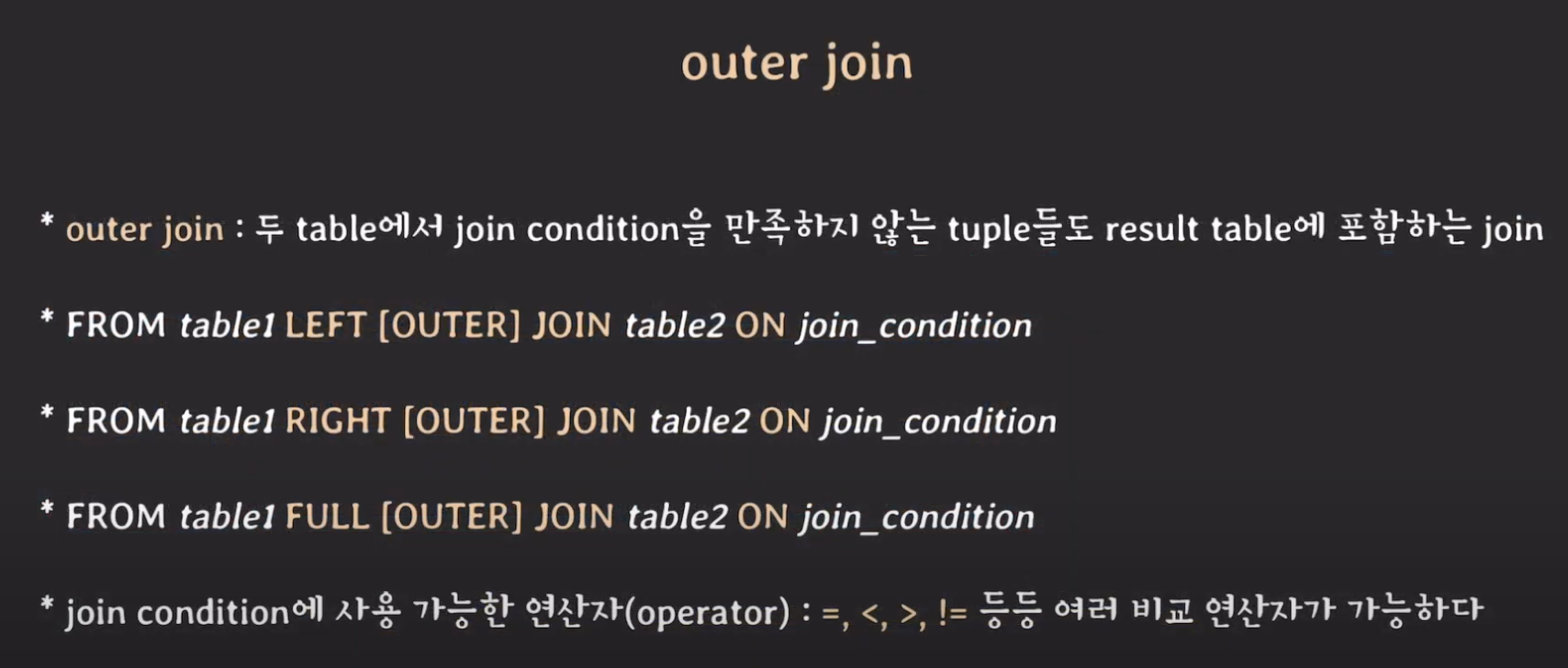그 다음으로 ⭐️outer join은 두 테이블에서 join condition을 만족하지 않는 튜플들도 result table에 포함시키는 join을 말합니다.