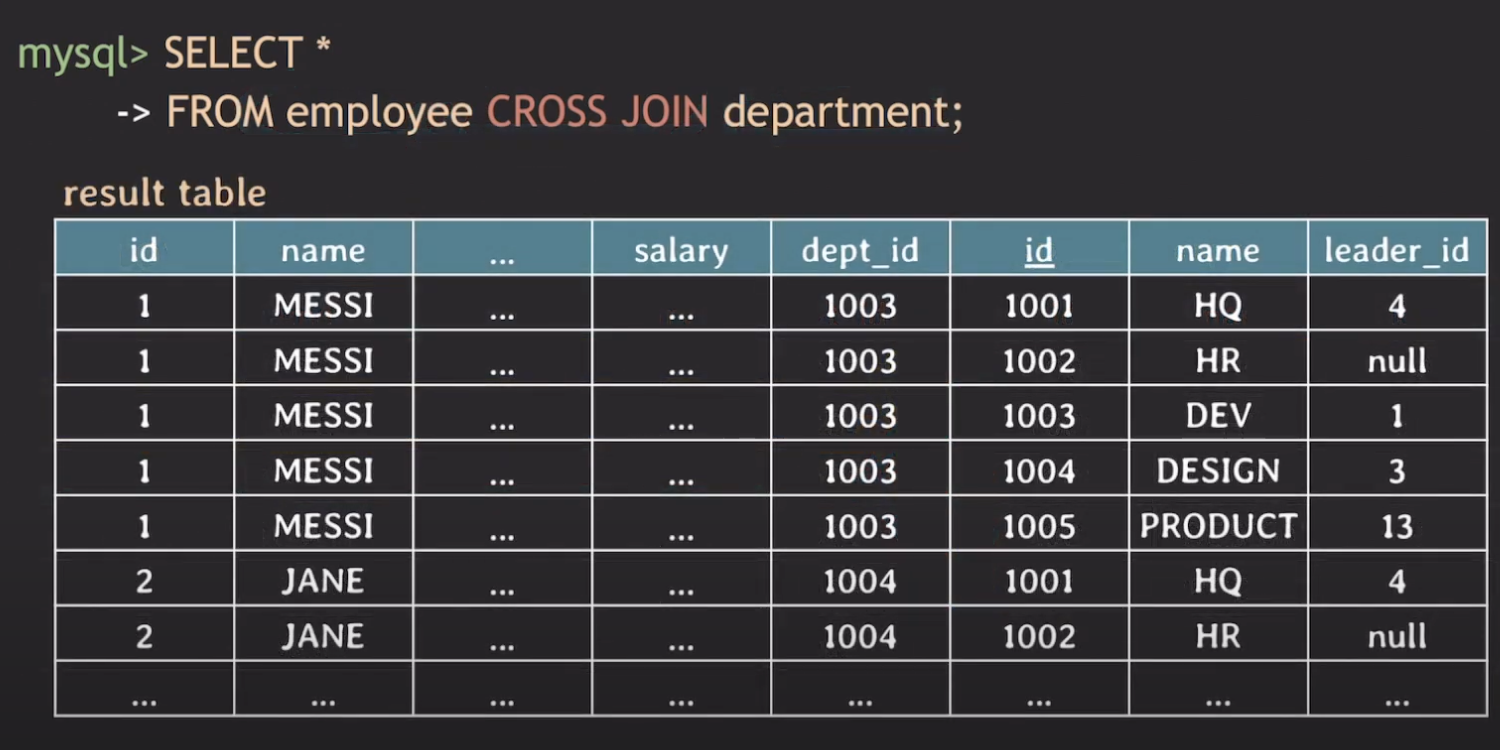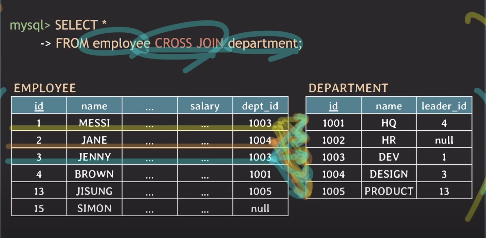 ❗️참고사항으로 mySQL에서 CROSS JOIN은 cross join = inner join = join 을 뜻합니다. 그리고 CROSS JOIN에서 ON (or USING)을 같이 쓰면 inner join으로 동작하고 INNER JOIN (or JOIN)이 ON(or USING)없이 사용되면 cross join으로 동작합니다.