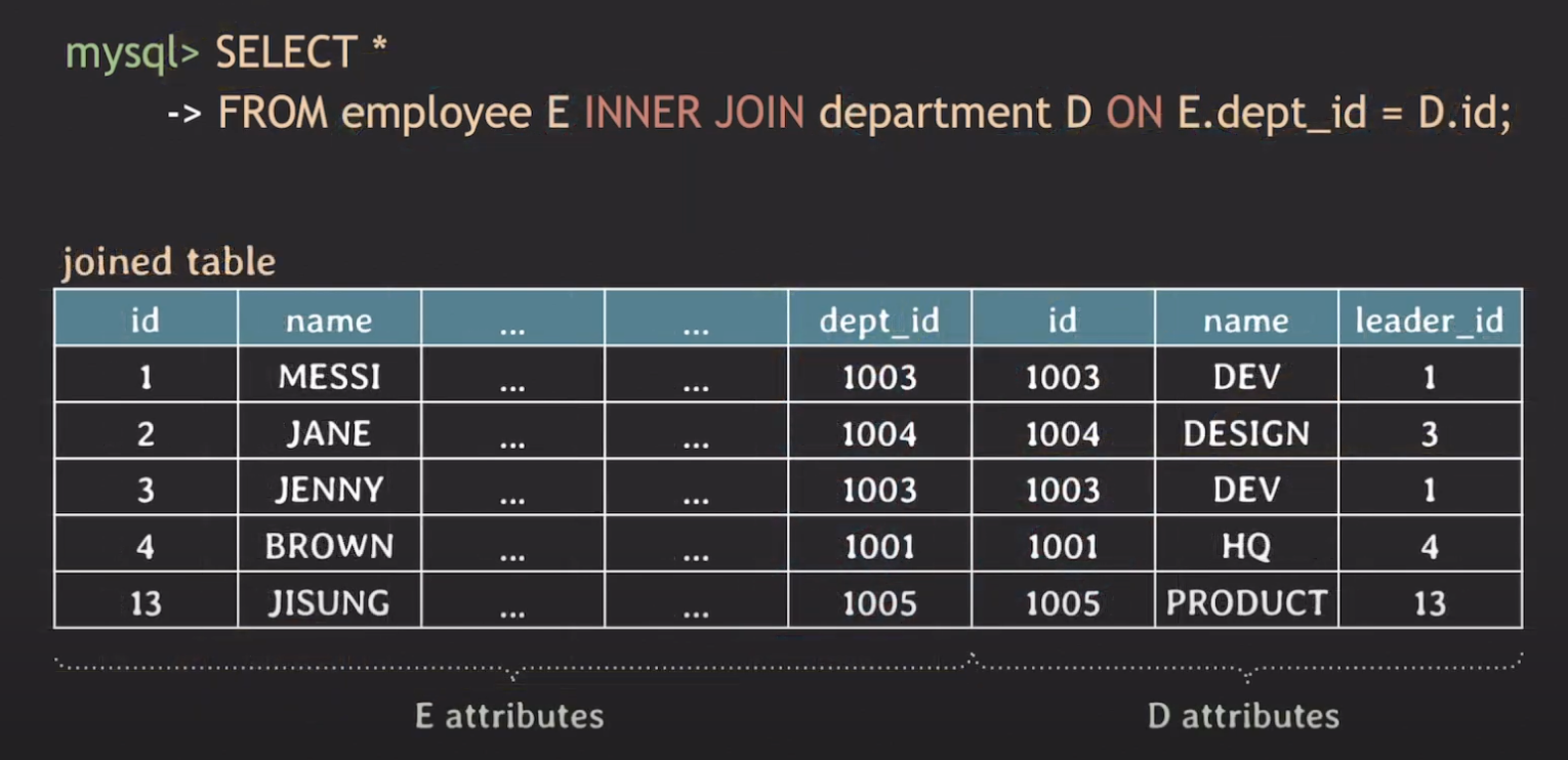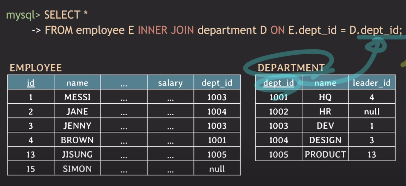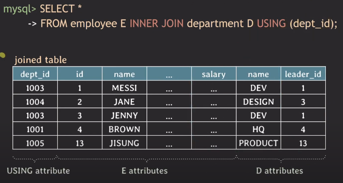 SELECT * FROM employee E INNER JOIN department D USING (dept_id);