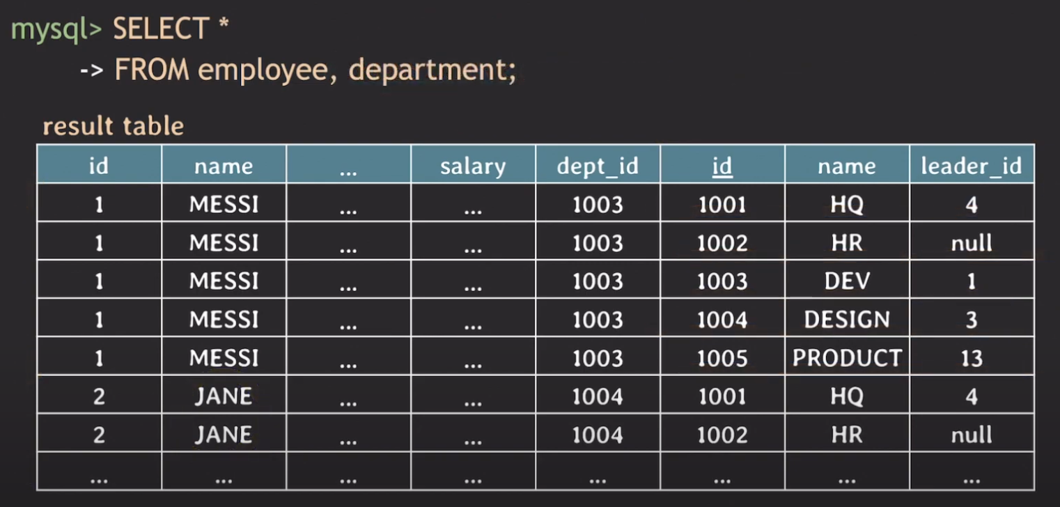 결과 값으로 모든 조합을 결과 테이블에 포함시켜서 반환됩니다. 아래 사진은 implicit cross join 방식이고 결과값은 같습니다.